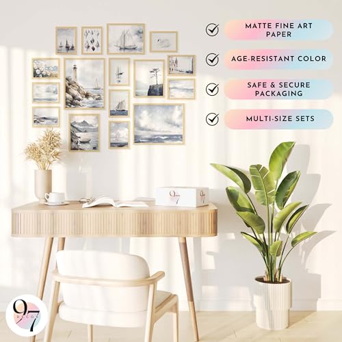 - Coastal Vintage Poster Set Gallery: Embark on a nautical journey with our Coastal Vintage Poster Set Gallery, featuring 2 large posters at 11×14 inches, 3 medium posters at 8×10 inches, and 11 small posters at 5×7 inches. Each piece captures the essence of coastal wall decor for bedroom and vintage coastal wall art.