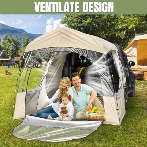 - 【Spacious & Comfortable】Measuring 6.8' W x 5' L x 7.8' H (excluding the vehicle connection part), this SUV tent comfortably accommodates 2-3 adults to sleep, or provides ample play space for 3-4 people, making it a great choice for family camping and outdoor gatherings.