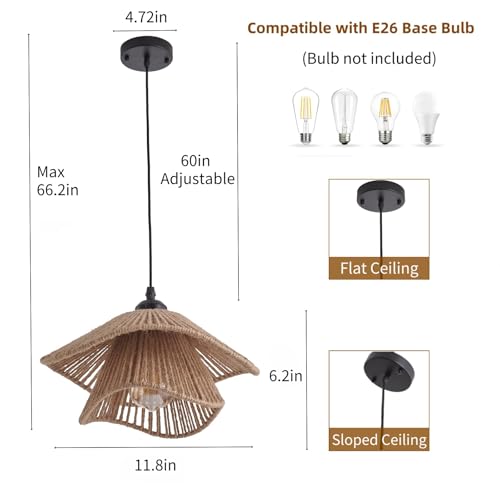 - [Bulb Specification] The woven boho pendant light is compatible with all types of 1xE26 incandescent/LED bulbs up to 40W (not included); All hanging accessories are included in the package, it only takes a few minutes to install, and the twine fixtures can be adjusted in height as you wish.