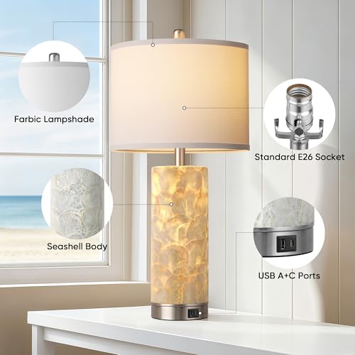 PARTPHONER Coastal Table Lamps for Living Room Set of 2, Bedside Lamps with Night Light, USB A+C Ports, 4-Way Rotary Switch, Seashell Nightstand Lamps for Bedroom and Home Office(LED Bulbs Included)