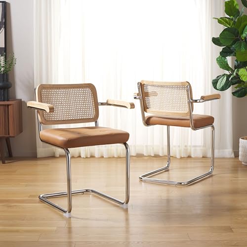 SAFAVIEH Home Collection Coralia Modern Coastal Cognac Faux Leather/Natural Rattan/Chrome Arm Chair Set of 2