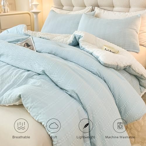 tohrisa Boho Comforter Set Full Size Striped Pleats Bohemian Seersucker Bedding Set All Season Soft Cozy 3 Pieces Quilt with 2 Pillowcases(80"X90" Light Blue)